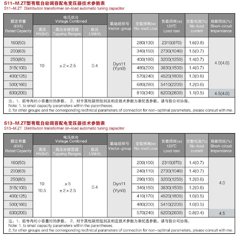 S11(13)-MZT型有载自动调容调压配电变压器是一种具有大小两种额定容量,根据用户所带负荷大小由自动调容控制器自动检测判断,并通过有载调容调压开关,在变压器不停电状态的下,对变压器两种容量进行自动切换,现对运行过程中变压器容量大小自动调整,从而实现两种额定容量运行方式自动转换的配电变压器。
